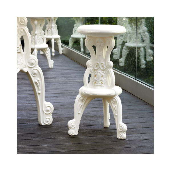 Mister of Love high stool is an element of the Design Of Love collection, designed to be combined with the Master Of Love high table. Mister Of Love recalls the lush shapes of the Baroque style, reinterpreting them in a pop key, thanks to the material with which it is made and the colors available, ironic and able to attract attention. Mister Of Love has a round seat, supported by curved legs and rich in details. The material in which it is made, polyethylene, is resistant and suitable for both indoor and outdoor environments, for contract or for unforgettable events.