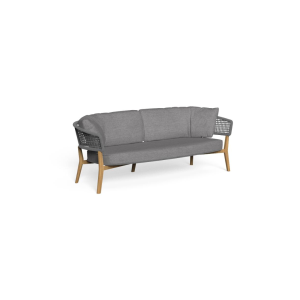 La estructura es de teca natural con reposabrazos y respaldo de aluminio tubular recubierto por un trenzado de cuerdas de tejido sintético gris.